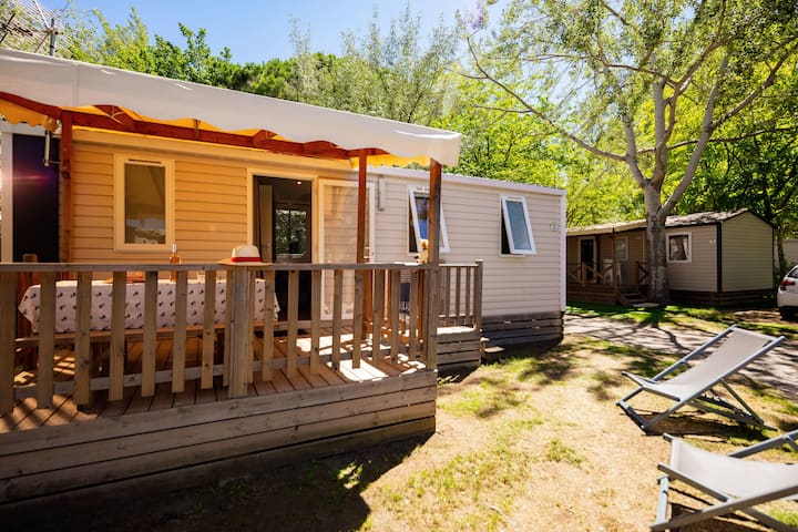انغمس في سحر البحر الأبيض المتوسط مع هذا البيت المتنقل، المثالي للعائلات أو المجموعات الصغيرة. يتميز بتراس مغطى ومطبخ صغير مجهز ومساحة معيشة مريحة وميزات حديثة، ويوفر الراحة والراحة. يقع على بعد كيلومتر واحد من شاطئ إسبيجيت وعلى مقربة من Grau - du - Roi، ويتمتع بالوصول إلى حمامات السباحة الساخنة وملعب للأطفال والملاعب الرياضية ومعالم الجذب المحلية مثل Aigues - Mortes و Port - Camargue Marina. مثالية لقضاء عطلة مريحة ومغامرة على شاطئ البحر.