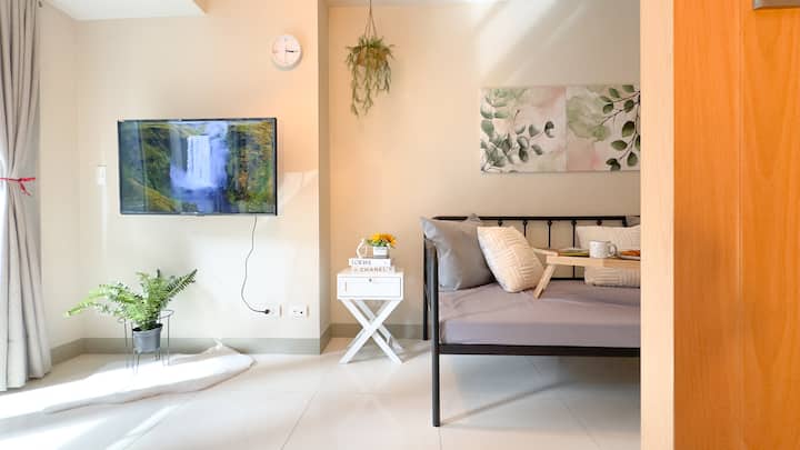 غرفة نوم واحدة مع شرفة في وسط المدينة في باجيو سيتي جاردنز + أدوات نظافة مجانية وقهوة