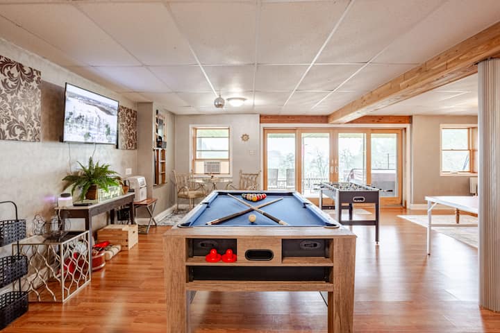 غرفة العائلة في الطابق السفلي مثالية للعب الأطفال أو البالغين لأنها غرفة الألعاب الخاصة بنا! السهام المغناطيسية وكرة القدم وكرة الطاولة والهوكي الهوائي وطاولة الورق وآلة الكاريوكي وطاولة بلياردو هناك أيضًا تلفزيون بشاشة مسطحة 32 بوصة مع عصا نار أمازون