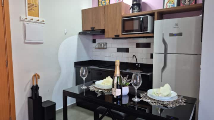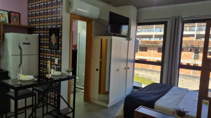 هذا استوديو رائع. سرير مزدوج داخلي، غرفة معيشة مزينة بدقة. مطبخ كامل يعمل بشكل جيد مع كل ما تحتاج إليه. الإنترنت.