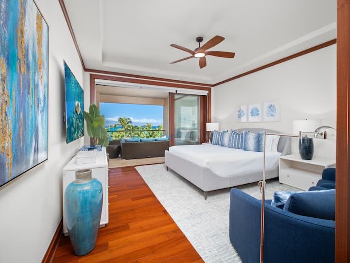 تم تزيين Maui Haven Premier Grand Residence 5201 في Montage Kapalua Beach بديكور ساحلي راقي مع أثاث عالي الجودة وقطع مميزة خيالية تمثل سمات المحيط والشاطئ. تخلق لوحة الألوان الباستيل باللون الأزرق والألوان المحايدة خلفية أنيقة وترحيبية بشكل غير رسمي لمنزلك بعيدًا عن المنزل.