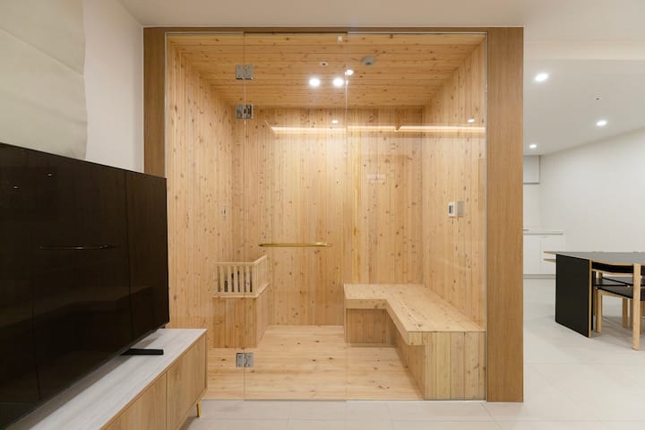 غرفة نوم واحدة (2 كوين) + غرفتا نوم (1 كوين) + ساونا سرو + مطبخ صغير + طاولة طعام لـ 6 أشخاص + أريكة + تلفزيون + حمامان (1 حمام مد والجزر)