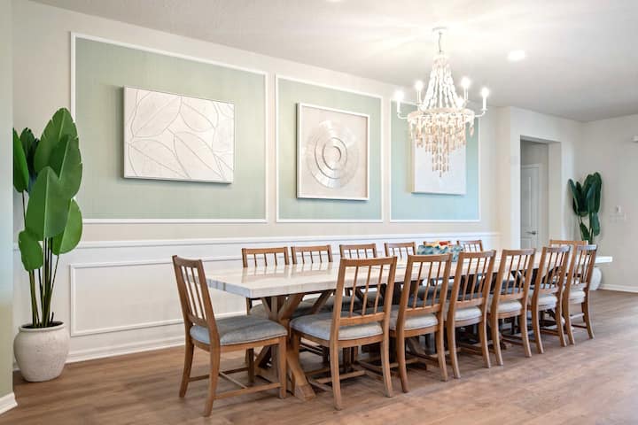 هذا منزل لطيف جدًا لقضاء عطلتك. إنه قريب من جميع المتنزهات الكبيرة، على بعد 15 دقيقة فقط من ديزني. لدينا 7 غرف نوم و9 أسرّة ناعمة. تحتوي إحدى الغرف على سرير بطابقين ممتع للأطفال! المنزل نظيف ويحتوي على أثاث لطيف. يمكنك الاسترخاء في الخارج على الفناء بجوار حمام السباحة المدفأ وتناول الطعام على الطاولة الكبيرة. في الداخل، لدينا مطبخ كبير مع آلة تحضير قهوة وخلاط. يمكنك مشاهدة الأفلام على أجهزة التلفزيون الذكية في جميع الغرف.