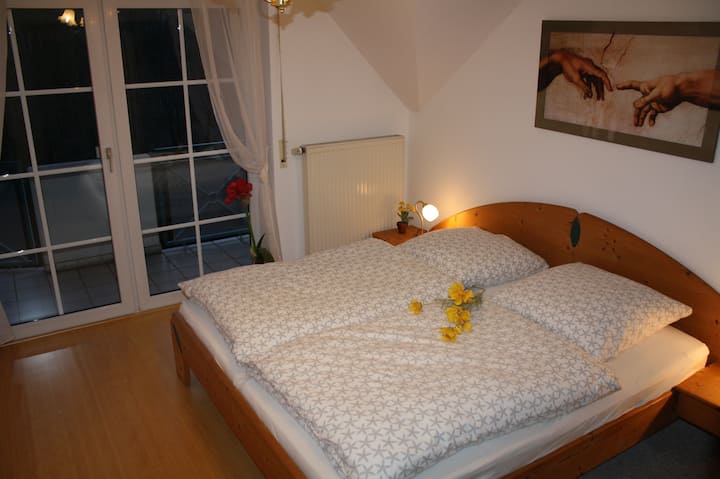 نحن عائلة مكونة من خمسة أفراد (كبروا جميعًا) ونعيش في نفس المنزل في Büdingen، حيث توجد شقتان للضيوف أيضًا في حديقة القلعة. بالطبع، حدائقنا ومداخل الشقق لدينا منفصلة، ولكن يتم مشاركة الوصول عبر السلالم الخارجية للبيت.