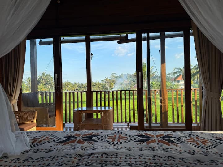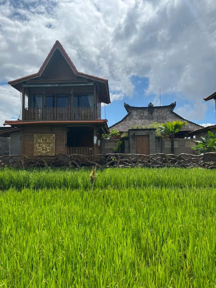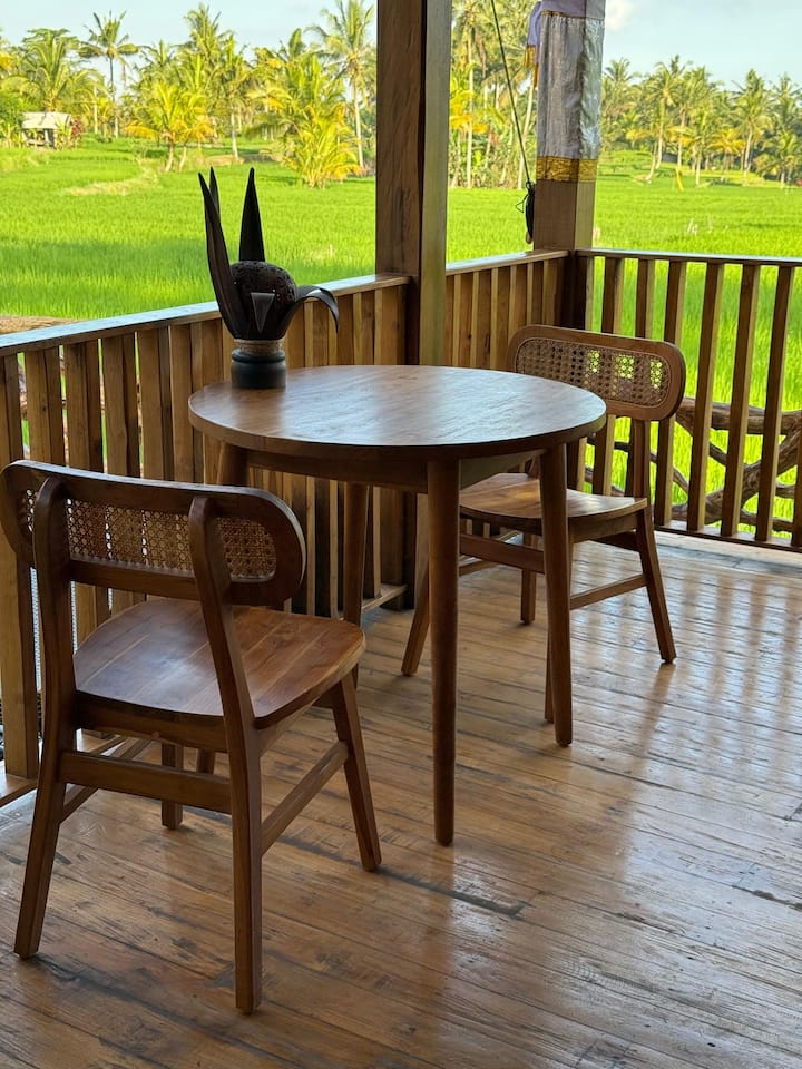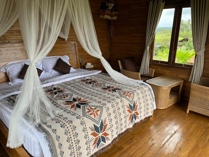بيت خشبي بإطلالة على حقل الأرز مع شرفة للاسترخاء