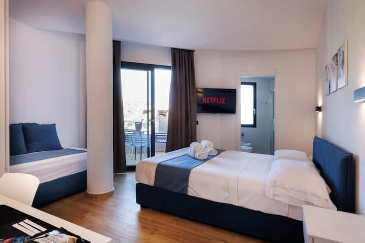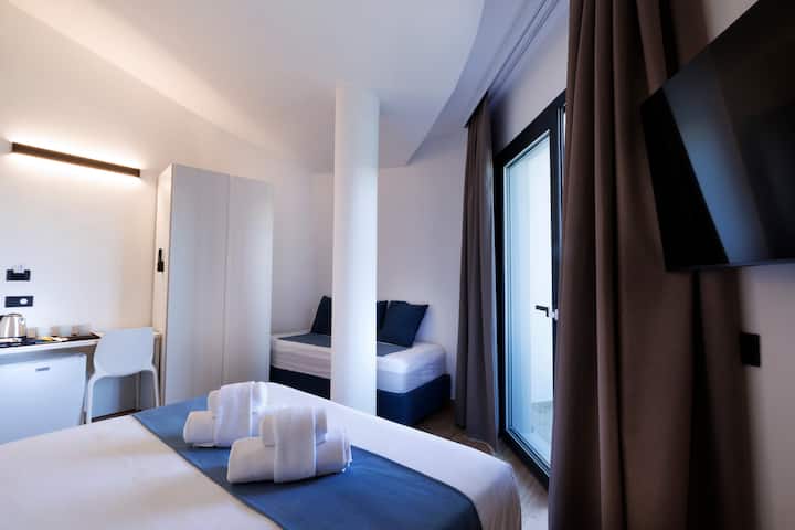 غرفة بثلاثة أسرة مع شرفة