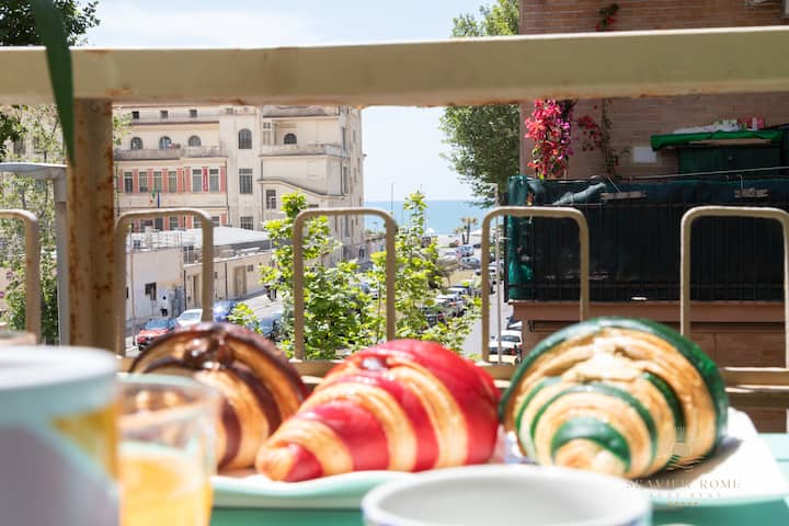 [شرفة مطلة على البحر] 7 أشخاص، حمامان، دقيقتان من البحر