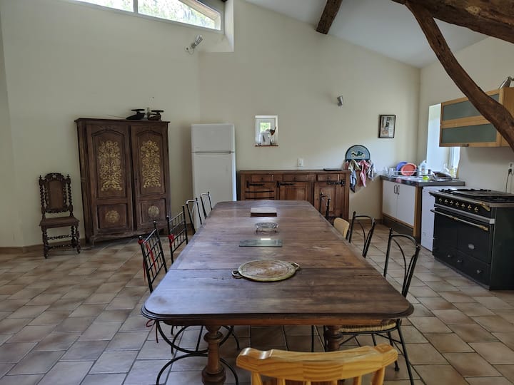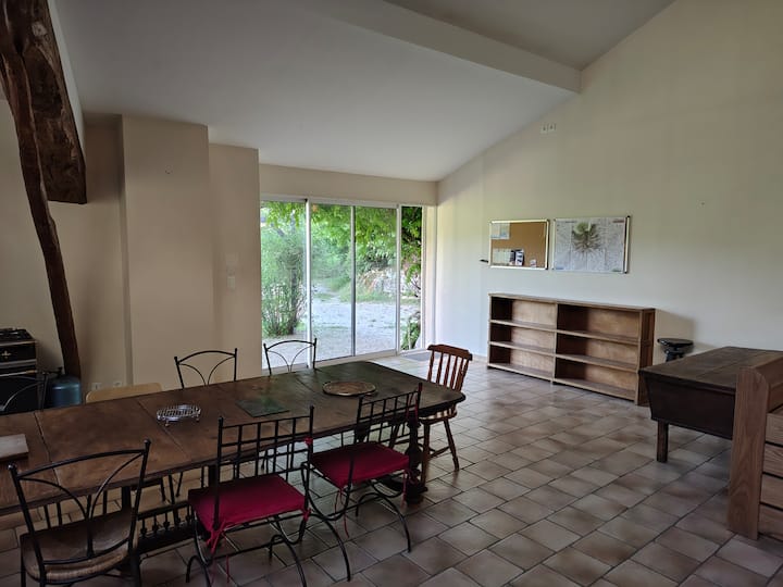 غرفة كبيرة (120 مترًا مربعًا) مع أريكتين وكتب وألعاب الطاولة والصالون و3 ألعاب مولكي وطاولة قهوة. المطبخ ومنطقة الطعام متجاوران. واي فاي.