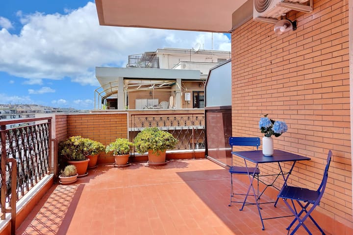 بنتهاوس في الطابق العلوي مع مصعد: غرفة نوم مزدوجة مكيفة الهواء، وحمام مع دش وغسالة، وغرفة معيشة مع سرير أريكة، ومطبخ مجهز تجهيزًا كاملاً، وتلفزيون ذكي. الميزة البارزة هي التراس المشمس الكبير مع طاولة وكراسي. يقع على فيالي أميغليو ديل بونو في أوستيا، على بعد خطوات من الشاطئ ومحطات الحافلات ومحطة قطار ليدو دي أوستيا ومحلات السوبر ماركت والبارات والمطاعم.