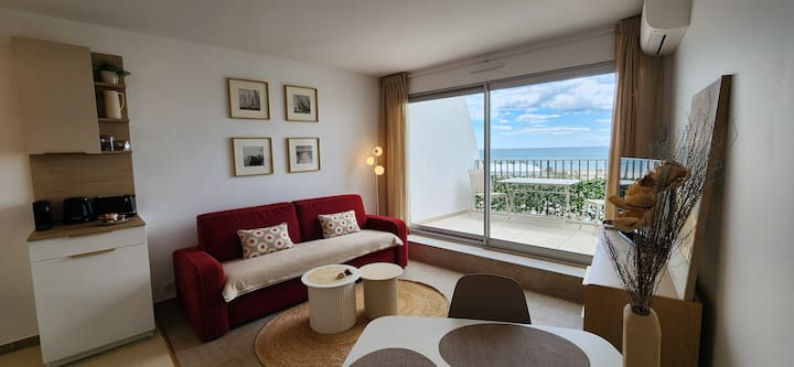 على الشاطئ مقابل البحر مع شرفة وموقف سيارات