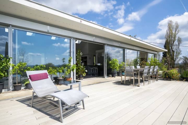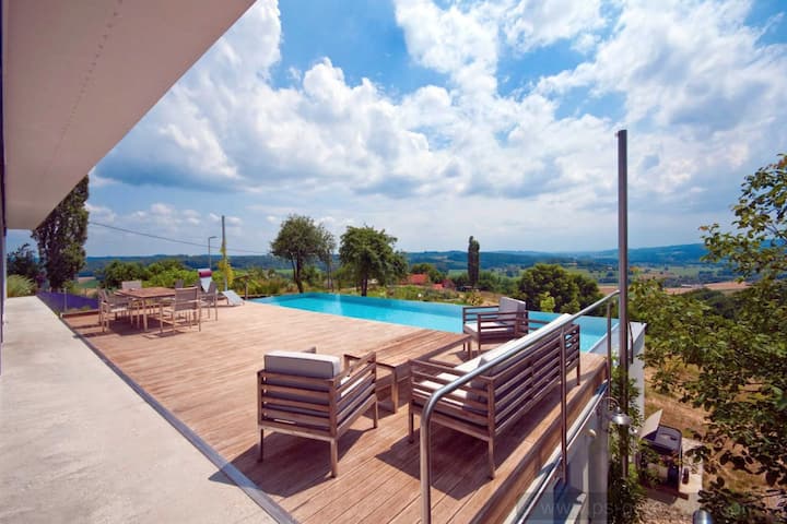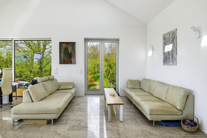 نزل متميز أنيق لما يصل إلى 4 أشخاص بالغين (عند الطلب حتى 6 أشخاص بما في ذلك الأطفال): عالية الجودة، قريبة من الطبيعة، أنيقة وملائمة للأطفال. غرفة نوم في البيت الرئيسي، بيت ضيوف بسرير مزدوج، مساحة نوم اختيارية للأطفال في بيت الشجرة. حديقة مع حمام سباحة ساخن ودش خارجي وشجرة وساونا ومنطقة شواء وقبو نبيذ. مطبخ وغرفة معيشة يغمرهما الضوء مع معدات التصميم، ومساحة تخزين كبيرة، وواي فاي، وغسالة ملابس. موقع هادئ للغاية، وإطلالات على الريف، ومواد طبيعية عالية الجودة، وموقف سيارات أمام المنزل مباشرة.