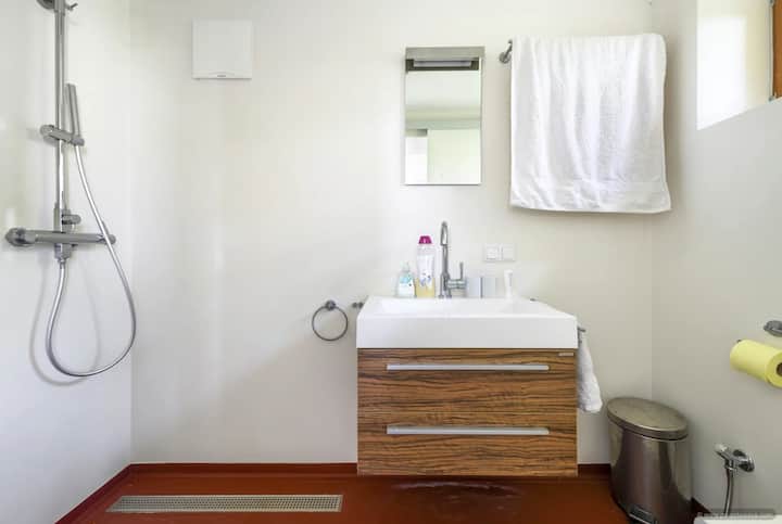 - مرحاض منفصل مع حوض (الغسالة والمجفف مخفيان أيضًا خلف باب منزلق في هذه الغرفة - لذلك لا تكاد هناك أي ضوضاء عند تشغيلهما)