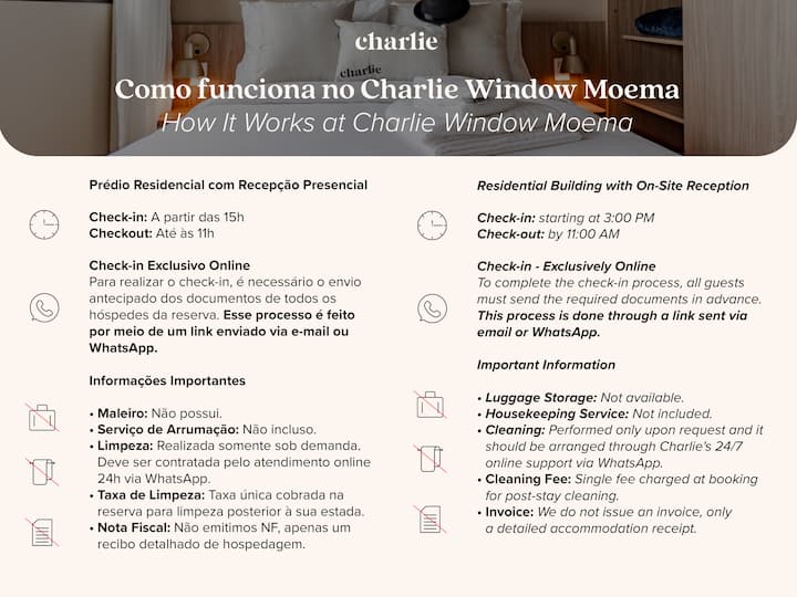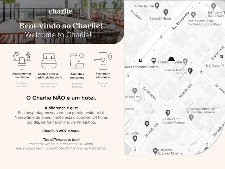 مرحبًا بك في تشارلي، تصرف كأنك في بيتك! في تشارلي تجد شققًا مفروشة وجاهزة للعيش، مع سرير فندقي ونبورسيو، وميزات حصرية، ولكننا لسنا فندقًا. ما الذي تعنيه ؟ نحن موجودون في المباني السكنية حيث يمكنك البقاء طالما تريد، 1 يوم، 1 شهر أو 1 سنة. أثناء إقامتك، إذا كنت بحاجة إلى خدمات إضافية أو طرح أي أسئلة، فما عليك سوى الاطلاع على الكونسيرج عبر الإنترنت على مدار 24 ساعة. هدايا في سامبا، RJ و POA!