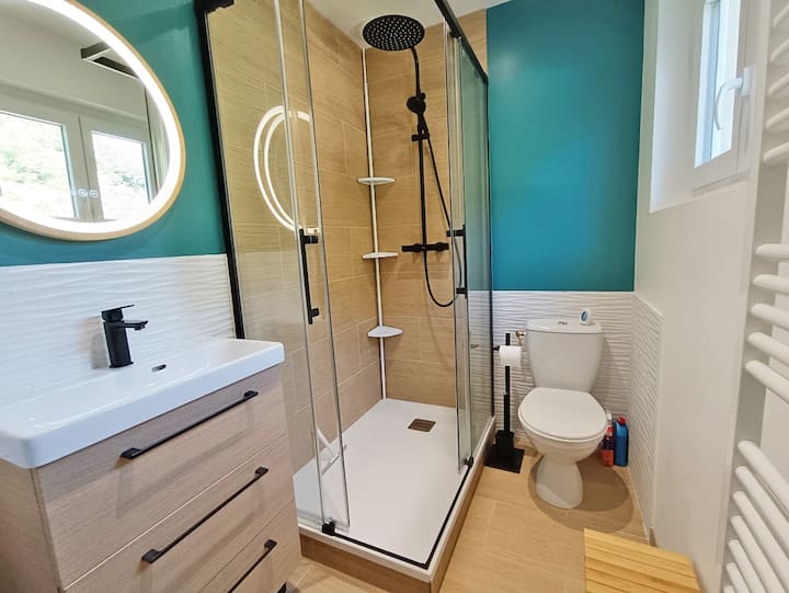 يضم هذا السكن، الذي يتسع لـ 6 أشخاص، غرفة معيشة ومطبخ مستقل وغرفتي نوم تطلان على الشرفة وحمام مع مرحاض وتراس. القدرة على شحن سيارتك الكهربائية إذا كنت تستأجر المرآب.