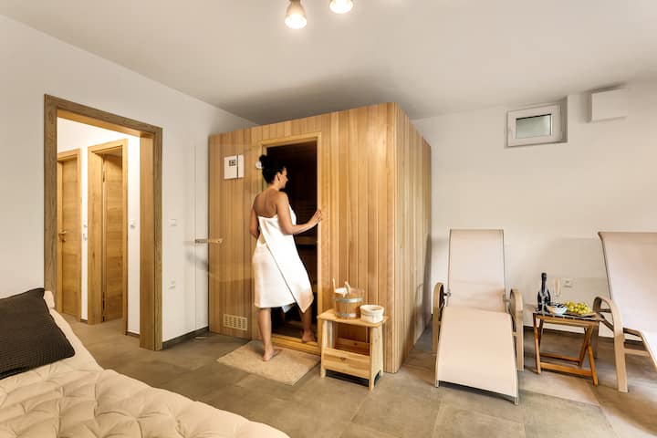 بيت لوكس ناتورا مع ساونا وحوض استحمام خشبي
