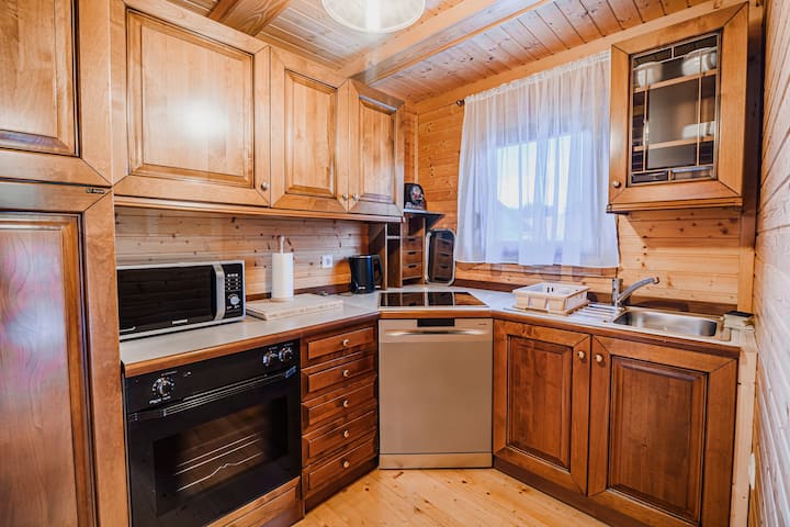 كوخ خشبي بإطلالة على فيستا مع حوض استحمام ساخن موسمي وغرفتي نوم