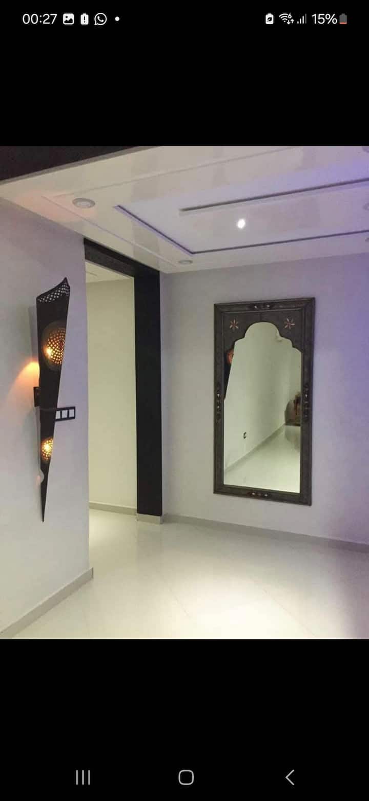 شقة مفروشة بالكامل بمساحة 114 مترًا مربعًا في وسط أغادير. يضم غرفة معيشة وغرفتي نوم مزدوجتين مع حمامات وشرفة مواجهة للجنوب ومكيف هواء وتلفزيون ومطبخ مجهز. على بعد 10 دقائق فقط من الشاطئ ووسط المدينة، بالقرب من المطاعم والمحلات التجارية والحانات والسوق. موقف سيارات مجاني في الشارع، وبواب على مدار الساعة طوال أيام الأسبوع، ووسائل نقل عام عند الباب.