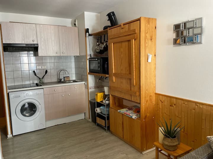 هذا البيت مجهز تجهيزًا جيدًا ومُعدّ بذكاء، مما يمنحك إحساسًا بالرحابة. يمكن لأربعة أشخاص الإقامة هناك دون أي إزعاج.