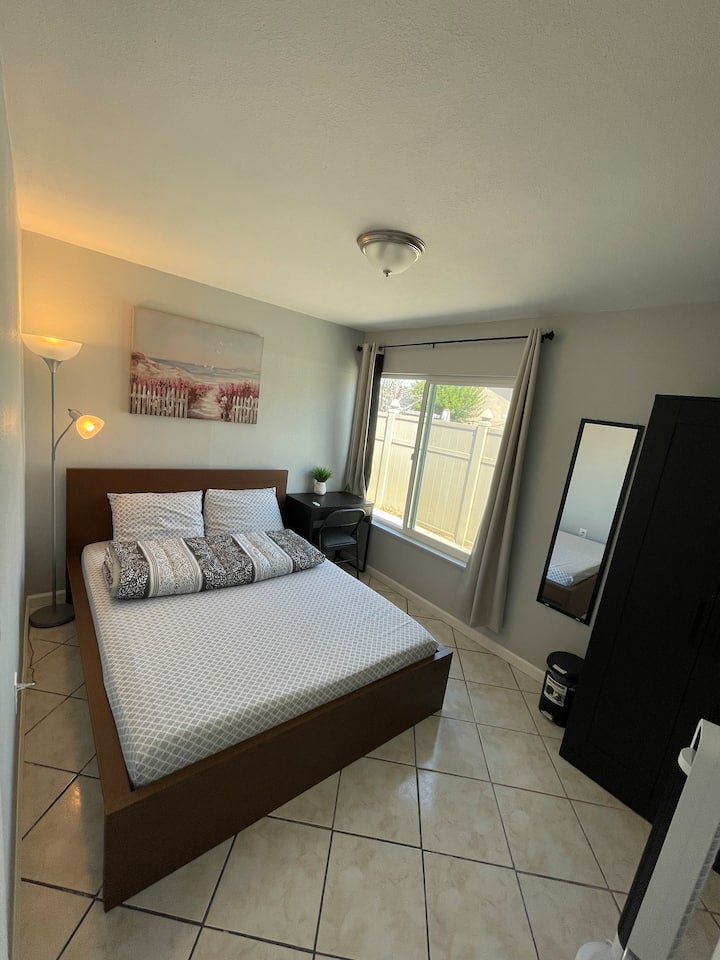 غرفة نوم مشرقة وجيدة التهوية مع حمام مشترك