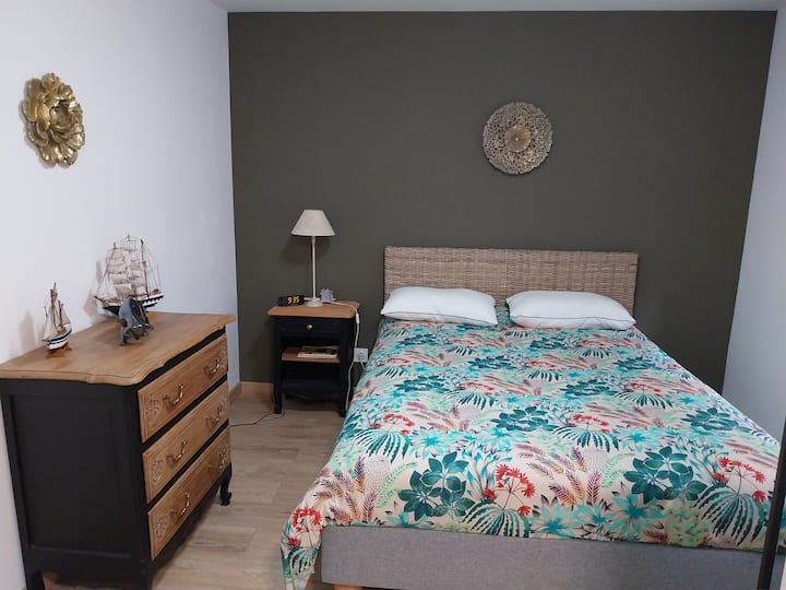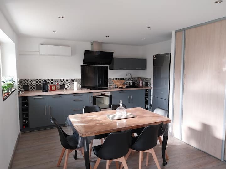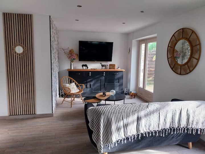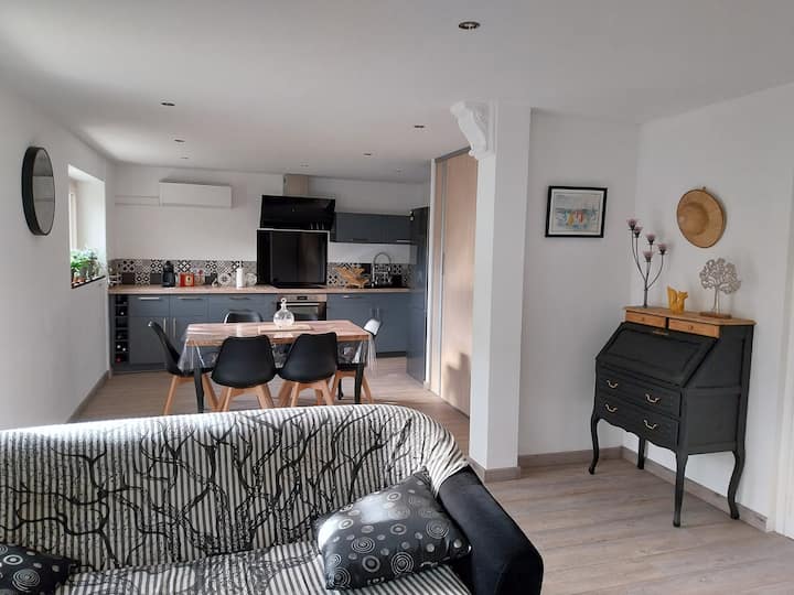 T2 جديد في الطابق الأرضي من منزل مع فناء خاص.