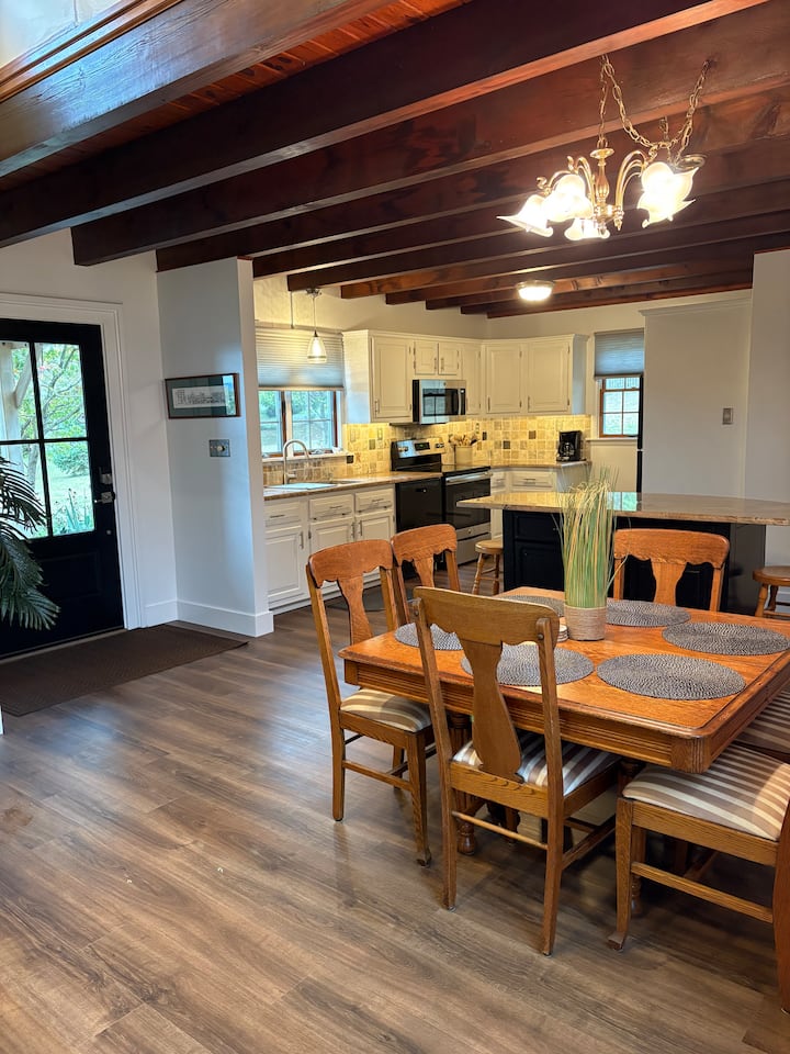 المطبخ مفتوح وجذاب، ويشمل كل ما قد تريده أو تحتاجه لإعداد وجبة. تحتوي منطقة تناول الطعام المنفصلة على طاولة تمتد إلى 10 أقدام لاستيعاب التجمعات. بين غرفة العائلة ومنطقة تناول الطعام، ستجد بابين فرنسيين يفتحان على سطح به مدفأة حطب لقضاء أمسيات مريحة في الهواء الطلق. استمتع بمنطقة الألعاب الخارجية للاستمتاع بالهواء الطلق، أو استرخ في منطقة التلفزيون مع واي فاي ومدفأة كهربائية لمزيد من الدفء. تم تزويد غرفة الألعاب بالكتب والبطاقات والألغاز وألعاب الطاولة لإبقاء الجميع مستمتعين. سيتمكن الضيوف أيضًا من الوصول إلى دراجة تمارين عام 1950 وبعض الأوزان الحرة إذا كنت ترغب في الحصول على القليل من التمارين أثناء إقامتك.