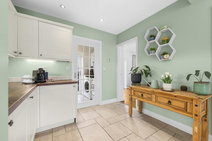 يستفيد المطبخ من مساحة تخزين وخزانة واسعة، وموقد 5 حلقات مع فرن مزدوج، وميكروويف، ومحمصة خبز Dualit وغلاية بوش، وثلاجة ومجمد تحت الطاولة، بالإضافة إلى ثلاجة/مجمد إضافي مستقل وغسالة أطباق. لقد قمنا أيضًا بتضمين ماكينة نسبريسو جنبًا إلى جنب مع مجموعة مختارة من كبسولات القهوة لتستمتع بها.