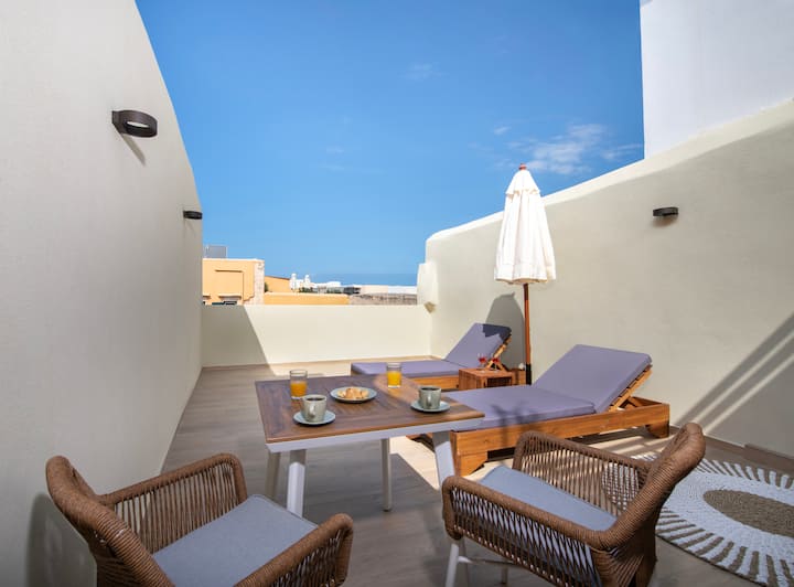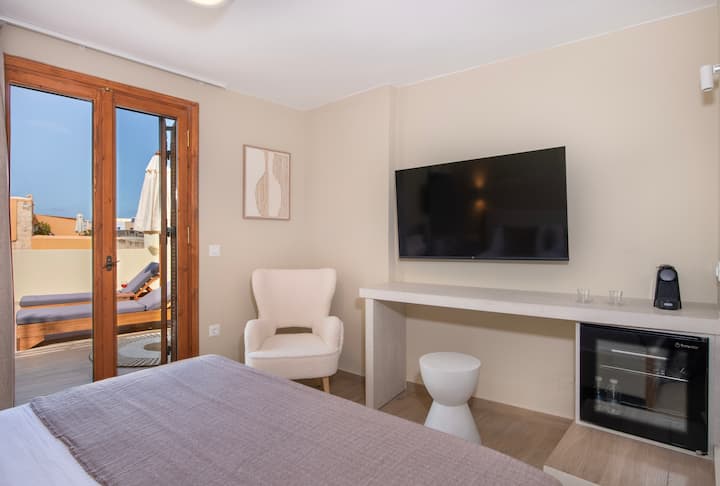 وهي مجهزة بكراسي للتشمس ومنطقة جلوس مريحة، وتوفر المكان المثالي للاستمتاع بوجبة إفطار على مهل، أو الاستمتاع بشمس البحر الأبيض المتوسط، أو الاسترخاء في المساء مع كوب من النبيذ. تطل الشرفة على أسطح المنازل الساحرة في بلدة خانيا القديمة، وتوفر مزيجًا فريدًا من الراحة والرومانسية في أجواء أصيلة.