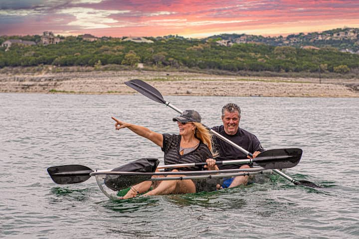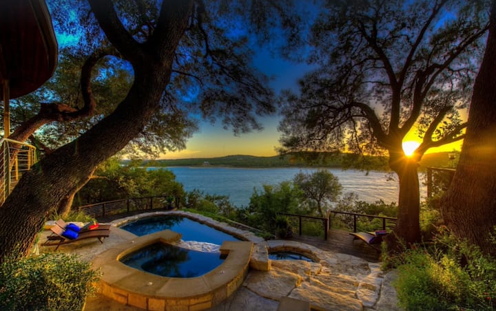 غروب الشمس في بحيرة ترافيس الملحمية! بيتزا، فرن، حمام سباحة، سبا، قوارب الكاياك