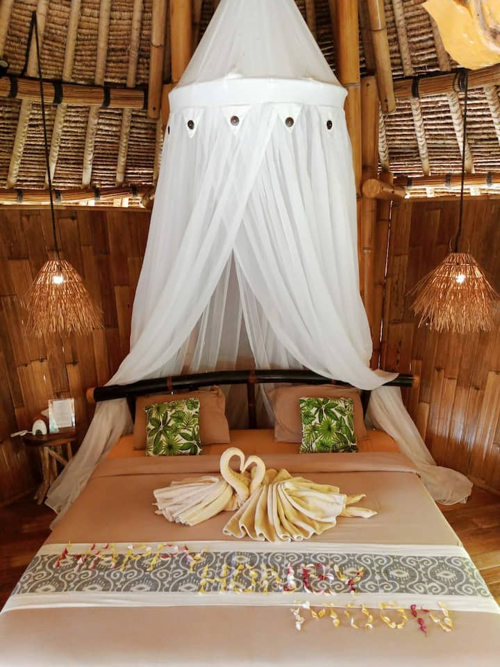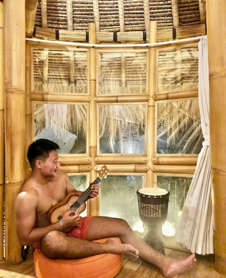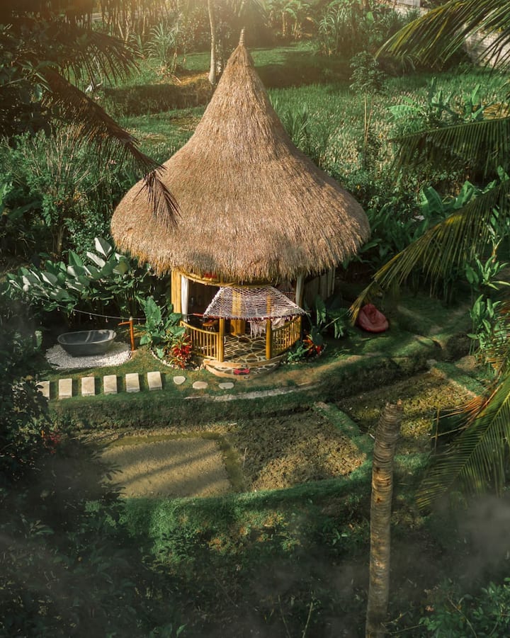 بيت من الخيزران مع شرفة شبكية في حقل الأرز