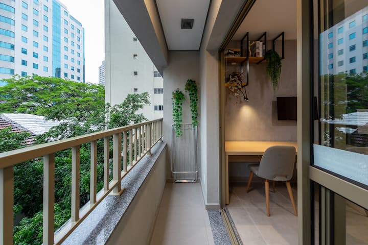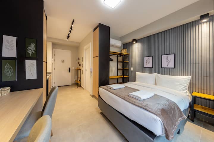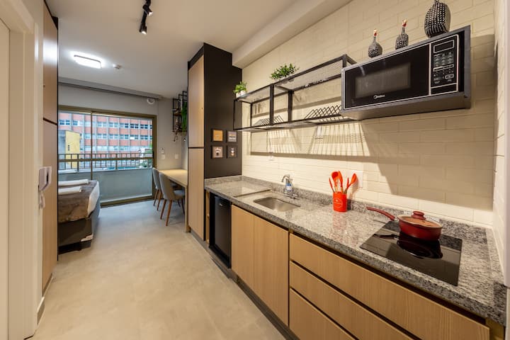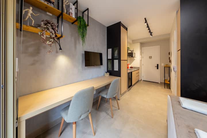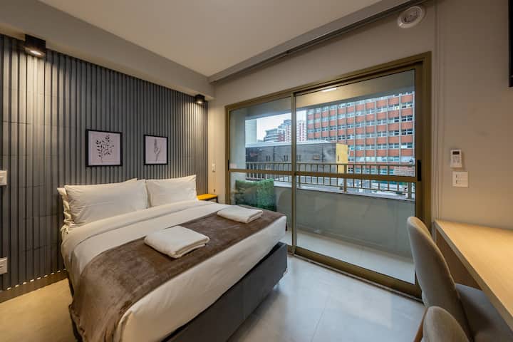 استوديو مساحته 25 مترًا مربعًا مع سرير مزدوج وتكييف هواء ومساحة متعددة الاستخدامات للمكتب المنزلي أو لتناول الطعام، مجهز بكرسيين مريحين. يحتوي على تلفزيون ذكي مع هوائي رقمي وقنوات كابل، بالإضافة إلى مطبخ صغير مع ميني بار وميكروويف وموقد حثي مزدوج الشعلة. كما تحتوي على شرفة جميلة.