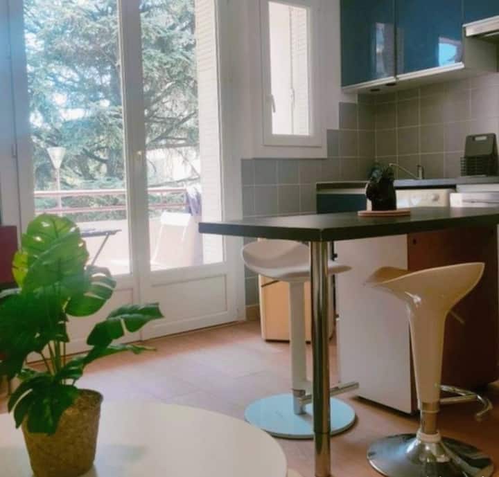 استوديو مريح وشرفة، مكيف الهواء، موقف سيارات، محطة قطار عالية السرعة