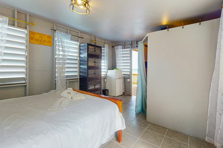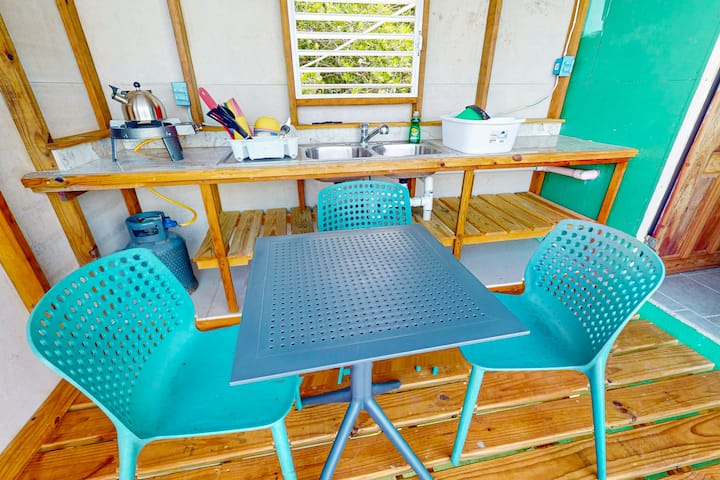 كوخ على الواجهة البحرية مع شرفة بإطلالة على البحر ومطبخ صغير