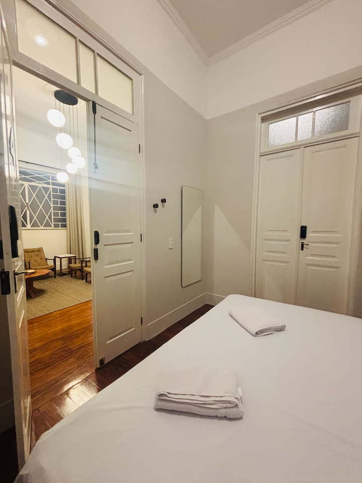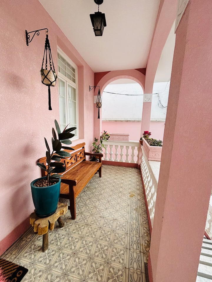 Áreas acessíveis aos hóspedes são: estacionamento próprio fora do local, mas no mesmo quarteirão; portão, lateral direita, escada frontal, varanda, dois corredores, seu quarto, três banheiros, uma cozinha e uma sala dupla. Os ambientes são amplos, com pé direito alto, e bem iluminados.