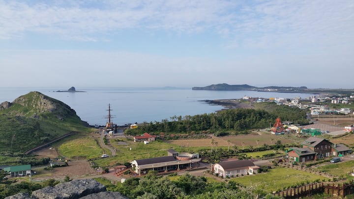 المنظر الرائع لجبل سانبانغسان، والبحر الأزرق في جيجو، وجزيرة الأخ في ذلك، وسونغاكسان تتكشف أمامك.
