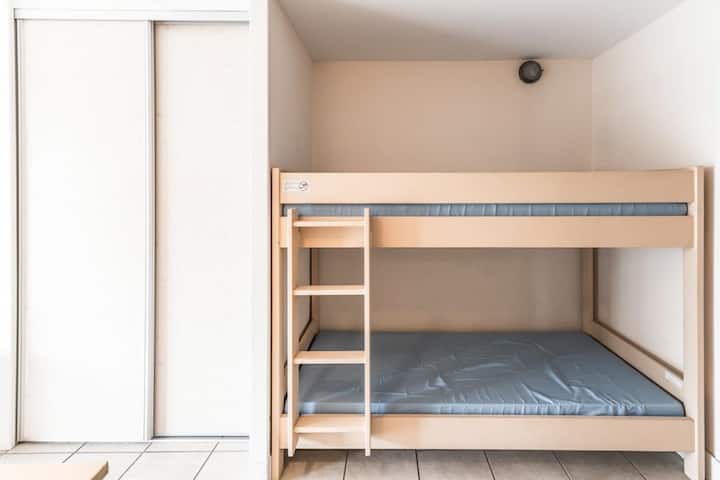 معدات غرفة المعيشة: سرير أريكة مزدوج ومنطقة كوخ واحدة مع سرير بطابقين. جانب الوجبة: طاولة مع 4 كراسي