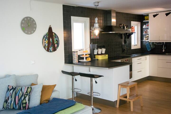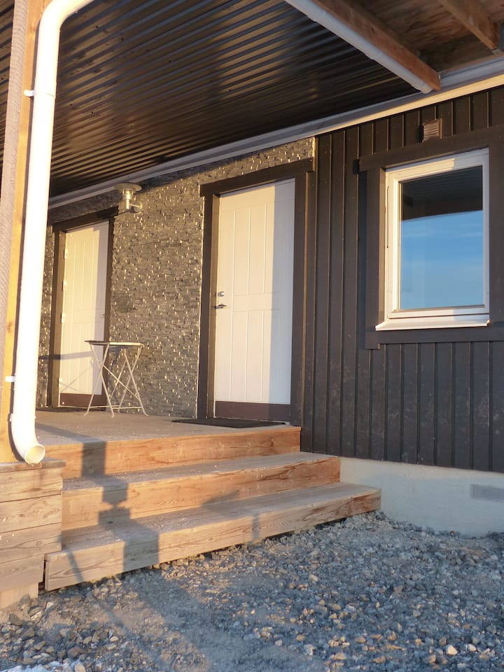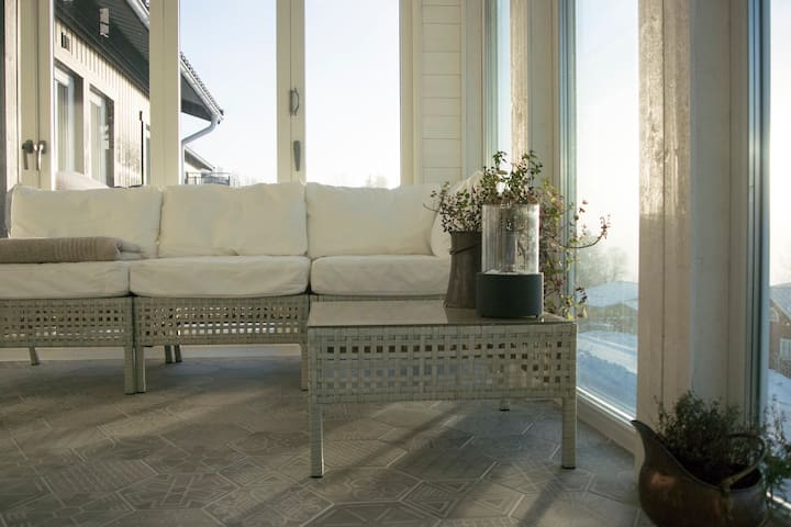 اسمي مالين أوكرلوند وأعيش في هذا البيت مع زميلي في السكن بير وكلبنا ساغا منذ أربع سنوات. ندير معًا علامة تجارية للملابس الرياضية ونعمل إلى حد كبير من المنزل، وبالتالي لدينا بعض الغرف في المنزل تُستخدم كمكتب. نحن نشعر براحة فائقة في آري ونحب وجود مثل هذه الفرص الرائعة لممارسة الاهتمامات الترفيهية مثل التزلج والجري وركوب الدراجات.