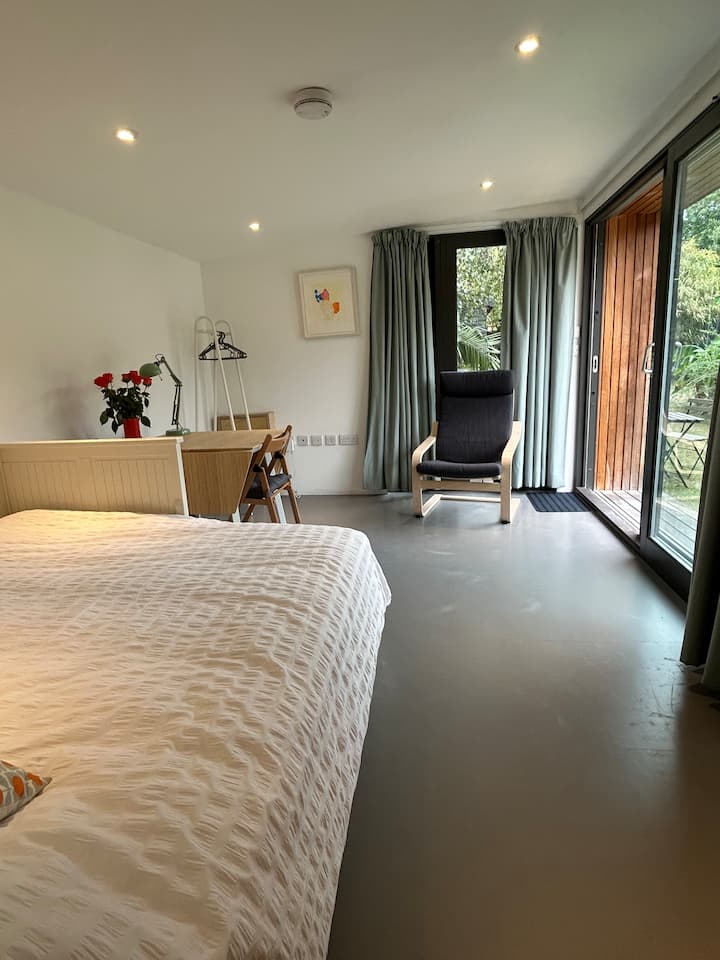لقد استضفت في كوخنا الخشبي المصمم من قبل مهندس معماري في حديقتنا الهادئة لمدة سبع سنوات واستخدمت Airbnb لجميع رحلاتي. أستمتع بمقابلة أشخاص من جميع أنحاء العالم، ومن المهم بالنسبة لي أن تستمتع بإقامتك في الكوخ. يعيش ابني الأكبر هنا، ويأتي ابني الأصغر وابنتي في بعض الأحيان أيضًا. أنا فنانة محترفة. يمكنني تقديم المشورة بشأن المعارض الحالية. أتطلع إلى مقابلتك.
