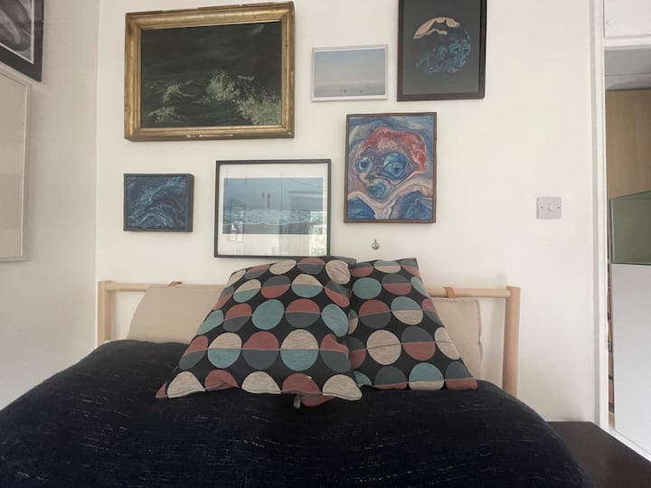 غرفة نوم فنية مريحة في بيت خاص في لندن.