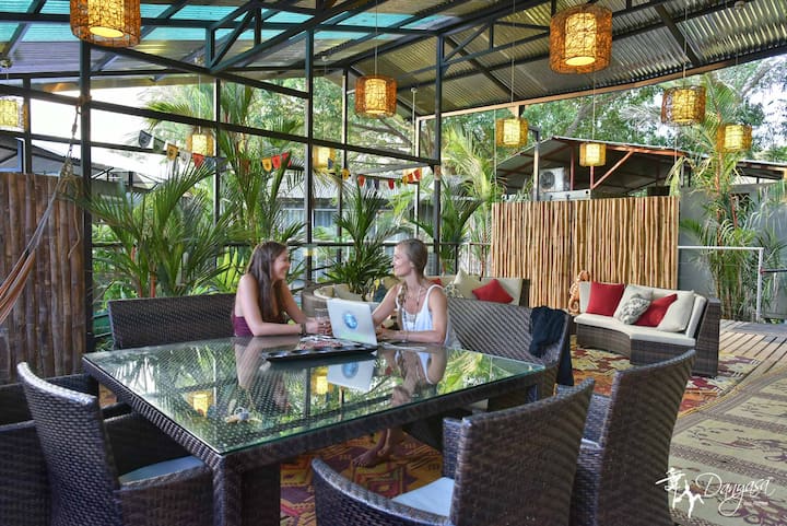 نحن موجودون بشكل عام ومتاحون للمساعدة. يفتح متجرنا أبوابه كل يوم ويمكن للموظفين مساعدتك في حجز جولات المغامرات أو دروس ركوب الأمواج أو أي شيء آخر قد تحتاجه. نحن نتسكع على السطح المشترك في بعض الأحيان، لكننا نعيش في بيت منفصل في العقار.