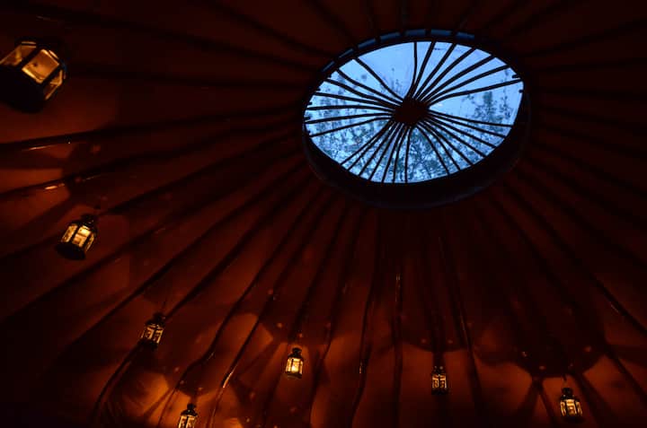 تم إنشاء إطار اليورت نفسه هنا في ورشتنا من الرماد المنسوج مع أعمدة متذبذبة تصل إلى العجلة العلوية مع نافذة واضحة إلى السماء. الفوانيس ، المعلقة من أعمدة السطح ، تلقي بتوهج دافئ وظلال جميلة في المساء.