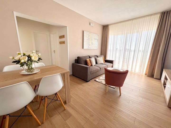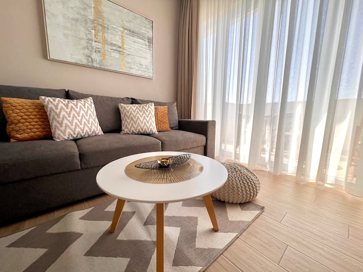 شقة فاخرة جديدة تمامًا بإطلالة على البحر وغروب الشمس