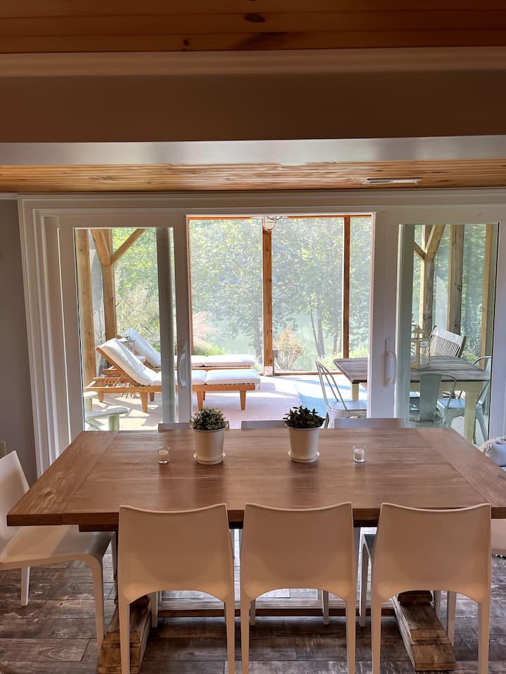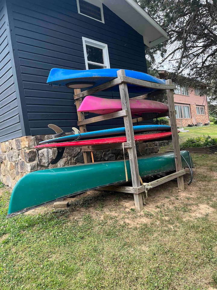 كوخ رائع مع رصيف نهر كبير. قوارب الكاياك