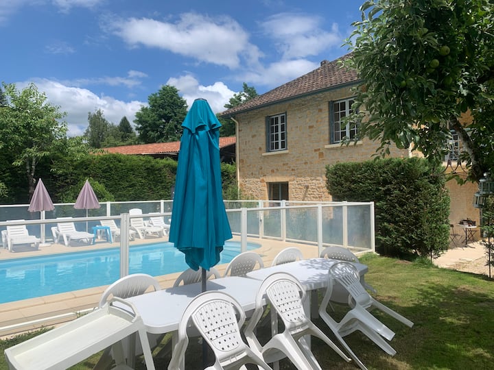 بيت ريفي هادئ، حمام سباحة، مكيف هواء على بعد 5 دقائق من وسط المدينة