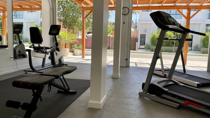 يمكن استخدام جهاز المشي/الركض الرياضي والدراجة الثابتة وسجادة اليوغا والأوزان الحرة لأداء التمارين الرياضية.