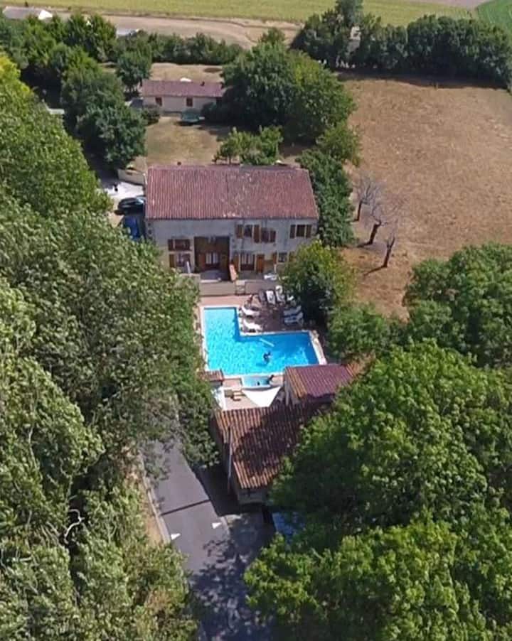 لديك البيت بأكمله، وتراس خاص حصريًا لاستخدامك. ستشارك حديقة اللعب وحظيرة الألعاب وحمام السباحة. المنزل ملحق بالأكواخ الأخرى في الجانب والخلف.