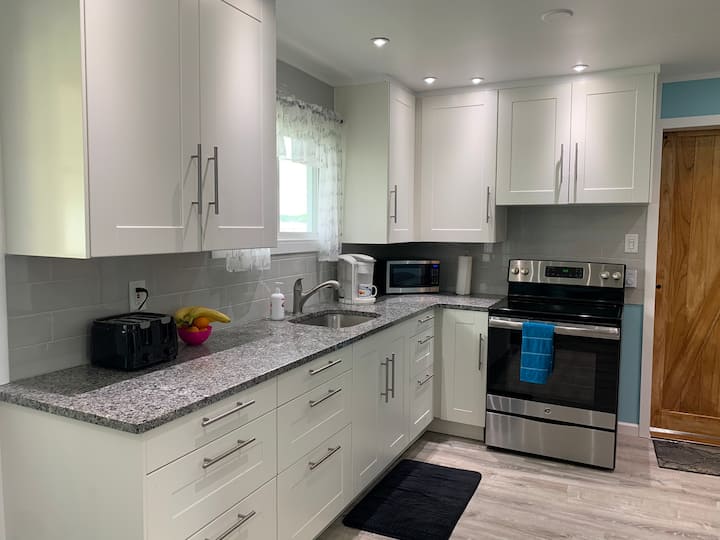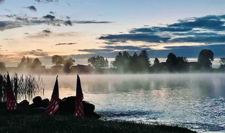 بيت على ضفاف البحيرة، شاطئ رملي صغير، رصيف، قوارب الكاياك، حيوانات أليفة