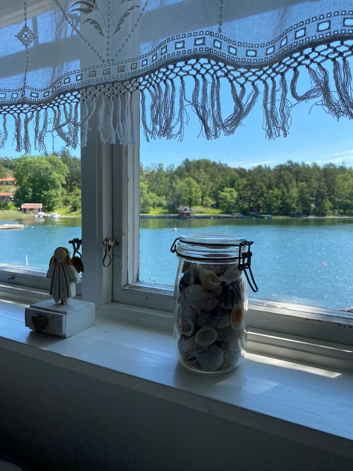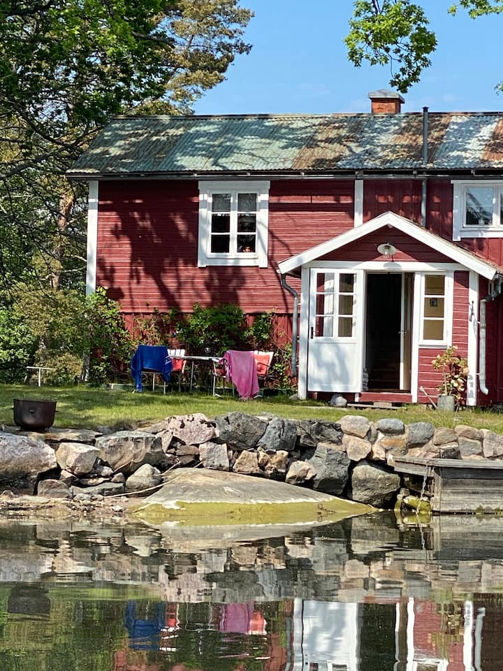 كوخ بحري على جزيرة صغيرة بجوار الماء، مع قارب.