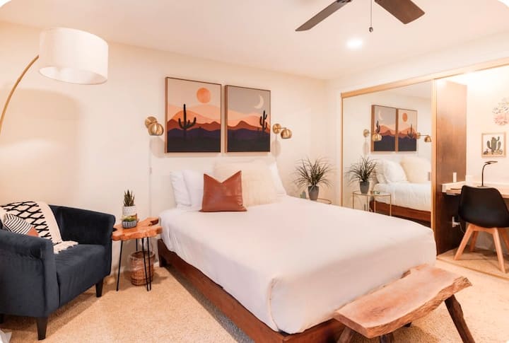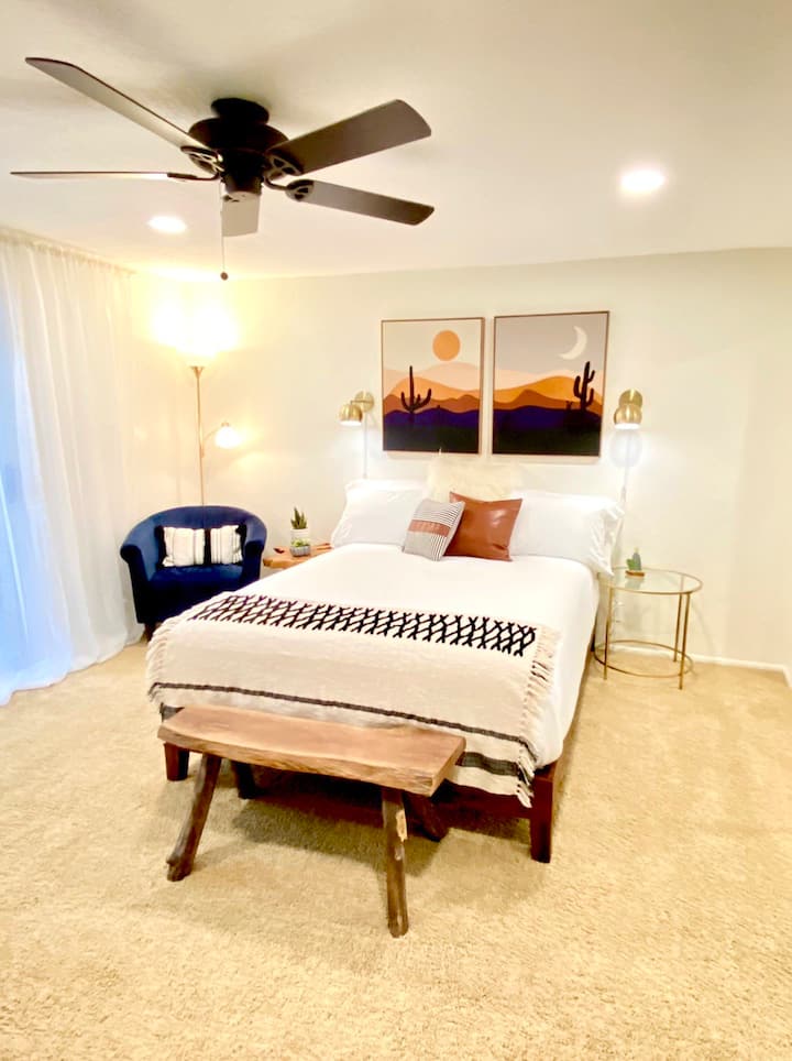 اشترينا بيتنا الفريد جدًا في عام 2018 ونعمل على إعادة تصميمه والمناظر الطبيعية منذ ذلك الحين. نظرًا لأننا فارغون، لدينا غرفتان في الطابق السفلي لم يتم استخدامها كثيرًا، لذلك فكرنا "لماذا لا تستخدم هذه الغرف لاستضافة الضيوف الذين يرغبون في الإقامة في إيجار عطلة ؟" لذلك وصلنا إلى العمل عليها بعد أن انتهينا من إعادة تصميم المناطق العامة في الطابق العلوي. لقد استغرق الأمر منا حوالي عامين لإنهاء غرف النوم والحمامات تمامًا - لأننا قمنا بمعظم العمل بأنفسنا - ولا يمكننا أن نكون أكثر سعادة بالطريقة التي تحولوا بها.
