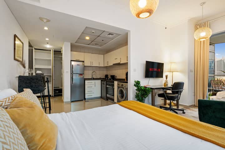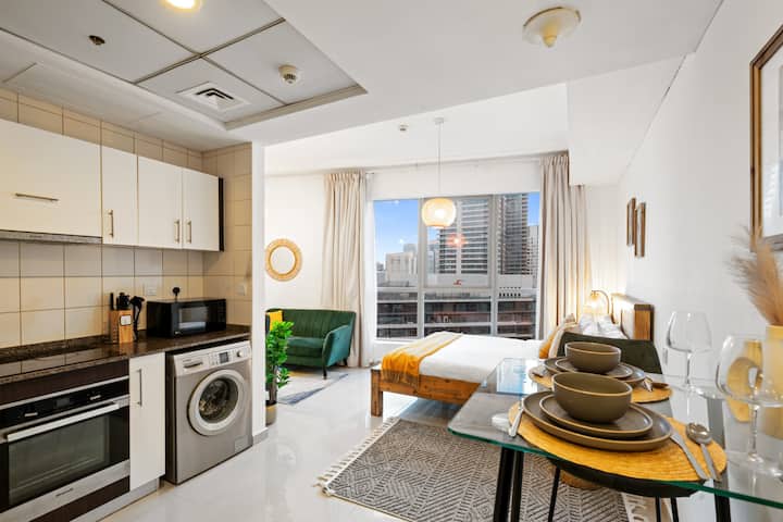 استوديو صغير مريح مع إطلالة جزئية على المارينا والشاطئ