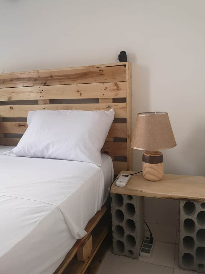 غرفة نوم رئيسية خاصة مع شرفة ومكيف هواء وواي فاي.